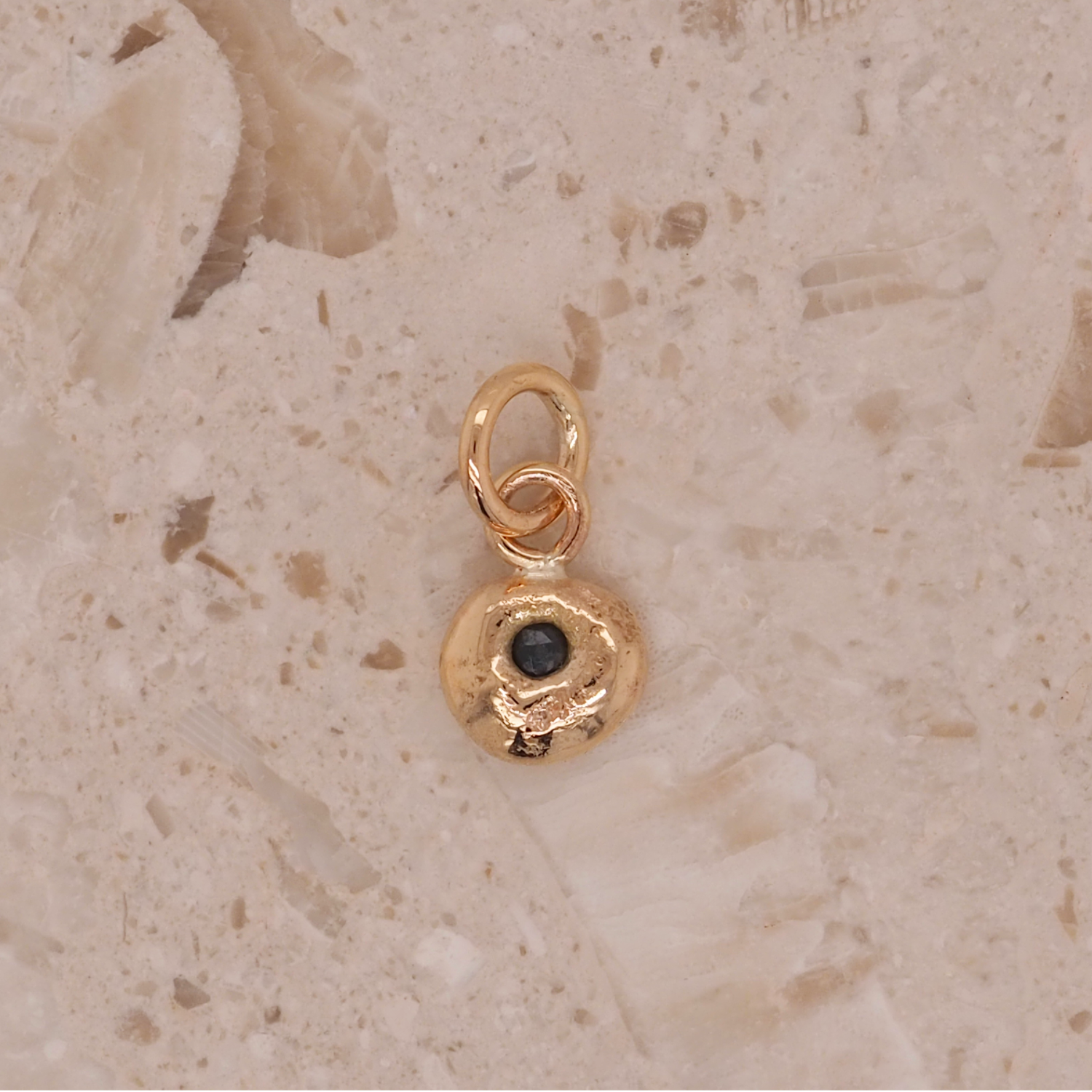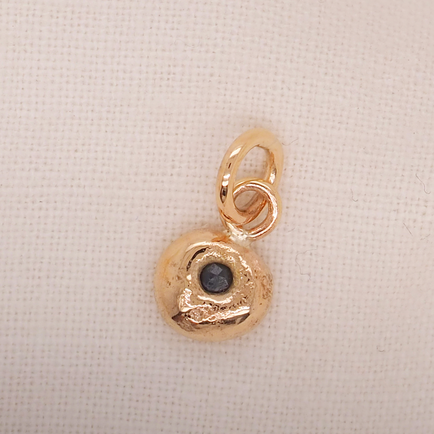 A handmade doughnut of recycled 9ct yellow gold, set with a brilliant cut blue Australian sapphire. On a large bail to slide onto almost any chain or necklace.