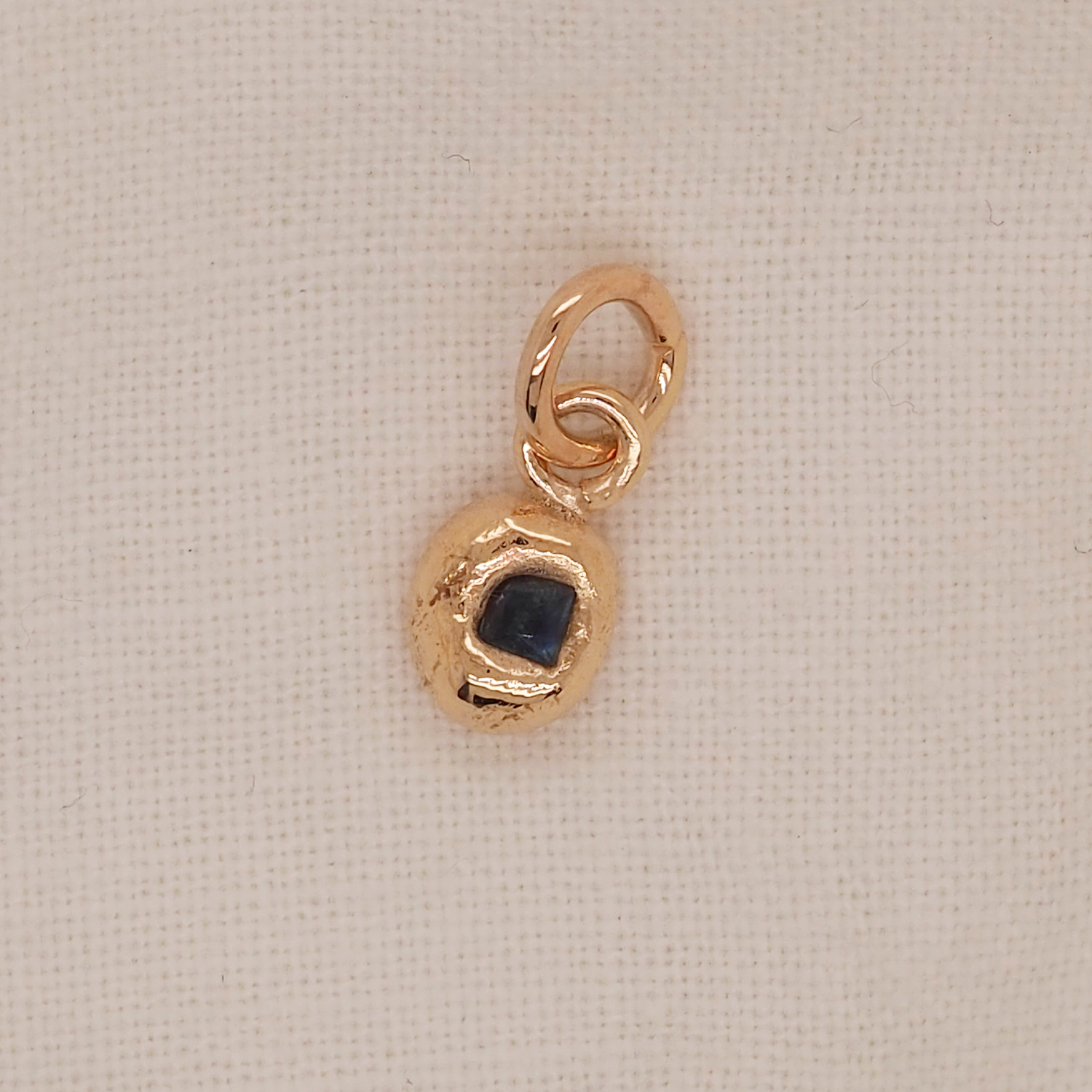 A handmade doughnut of recycled 9ct yellow gold, set with a dark green princess cut Australian sapphire. On a large bail to slide onto almost any chain or necklace.