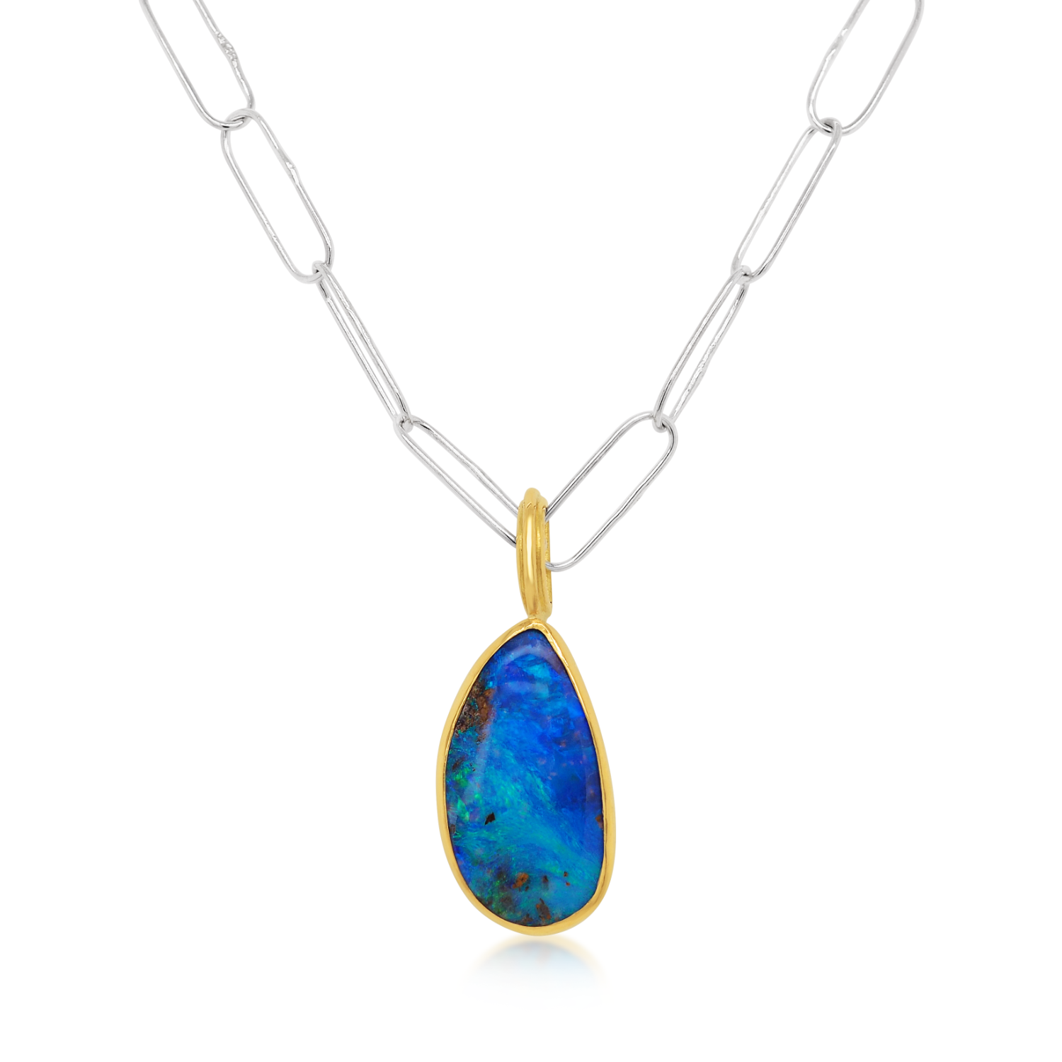 A 0.28ct Australian (Lightning Ridge) opal set in a sterling silver bezel, on an 18" string of tiny faceted blue tourmaline beads. Sterling silver clasp.
